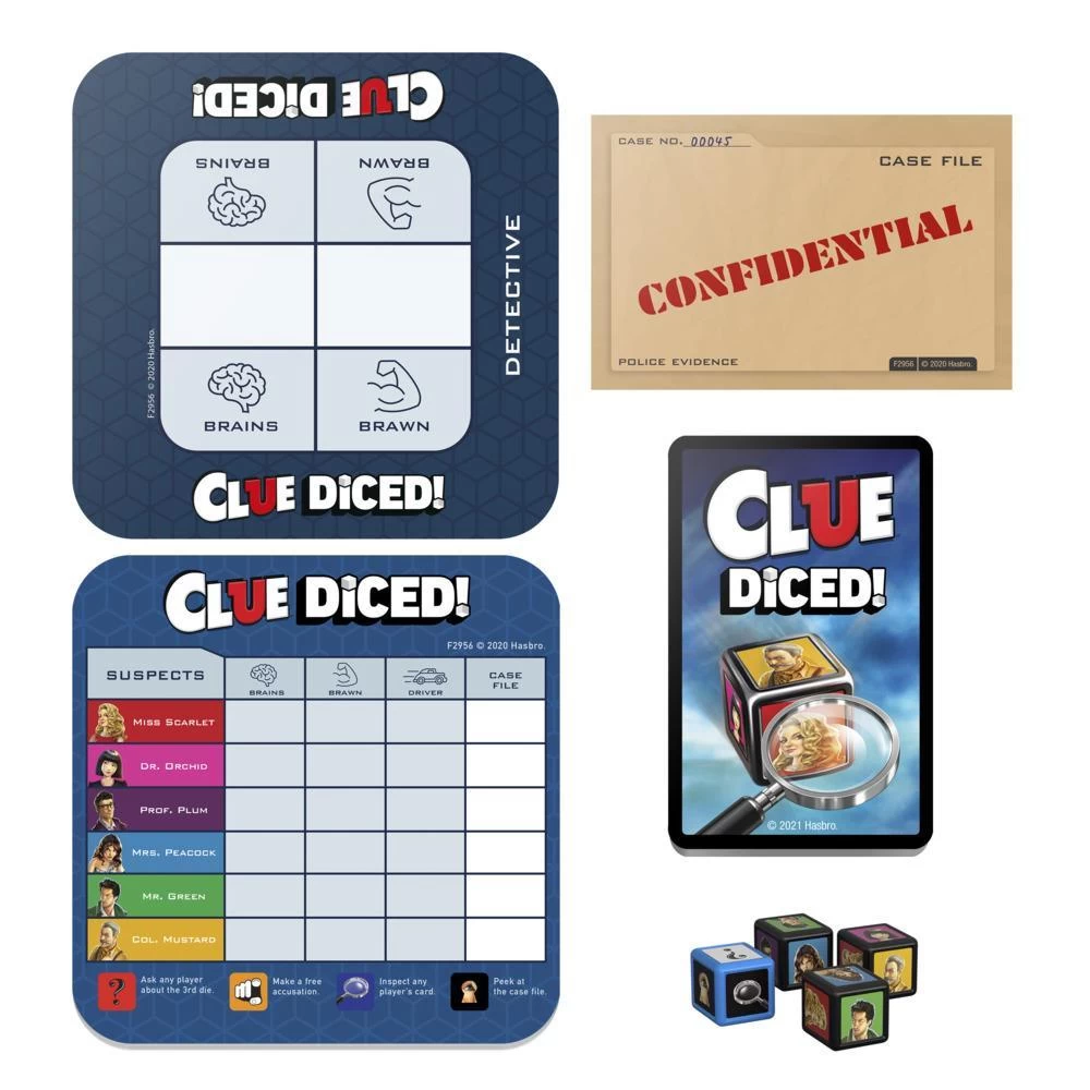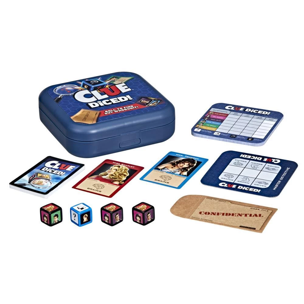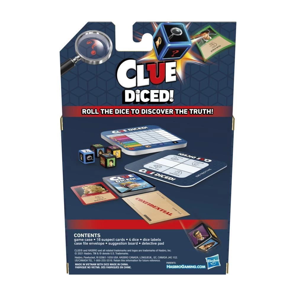 Ready, Set, Roll! It’s a different way to play the Clue game! Unlike the classic Clue game, this Diced edition has no gameboard and players roll to find out whodunit. This fun game has players rolling the Suspect dice and the Bonus die, getting closer to guessing the culprit as opponents reveal their cards. When a player is ready to crack the case, they secretly look at the cards placed inside the Case File envelope to reveal who was the brains and who was the brawn behind the crime. The Clue Diced game is a compact and portable game making it a great game for travel and for on-the-go play. It’s easy to learn, and if your kids are looking for a quick game, it can be played in under 20 minutes. The game is for 3-4 players, ages 8 and up. Also look for the Sorry! Diced game and the Monopoly Diced game. (Each sold separately. Subject to availability). Hasbro Gaming and all related trademarks and logos are trademarks of Hasbro, Inc.