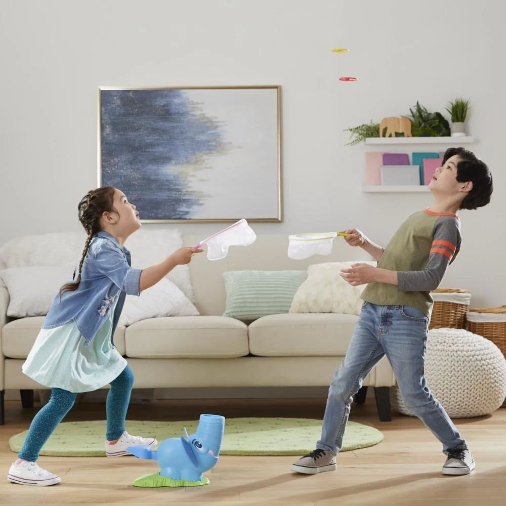 Join Elefun elephant in this spinning butterfly chase! The Elefun Flyers game is an exciting fluttering frenzy as kids try to catch as many butterfly flyers as they can in their nets. First, load the flyers into the elephant’s trunk, then step down on its tail to launch the spinning discs into the air. Catch them as they flutter in the air or grab them up when they land…they all count towards a final score. The player with the most discs wins the game. The Elefun Flyers game requires no batteries and features easy storage on the game unit. It makes a fun activity to do while staying at home, and can be a great birthday gift or holiday gift for preschoolers and kids ages 4 and up. The game is for 1-3 players so it’s fun to play with friends or solo. Hasbro Gaming and all related trademarks and logos are trademarks of Hasbro, Inc.