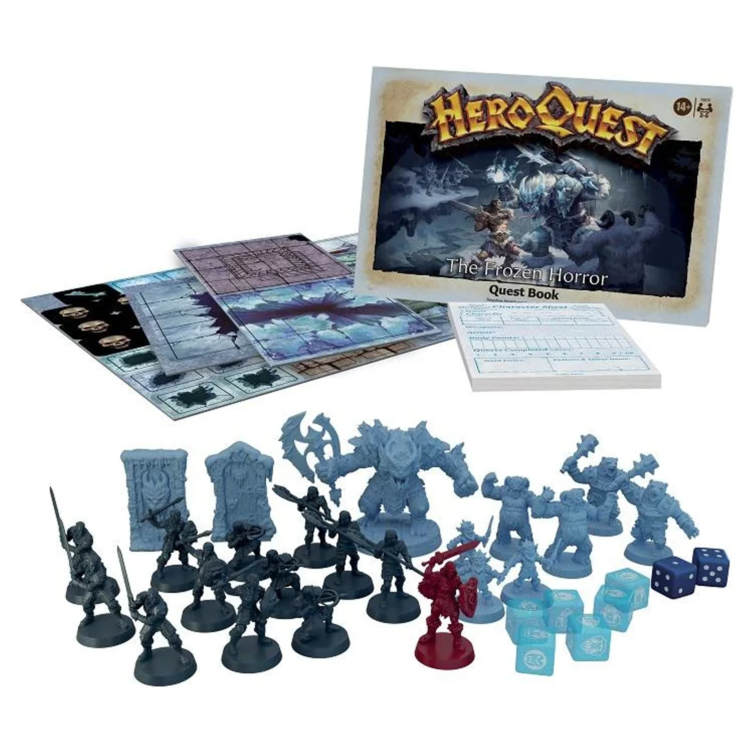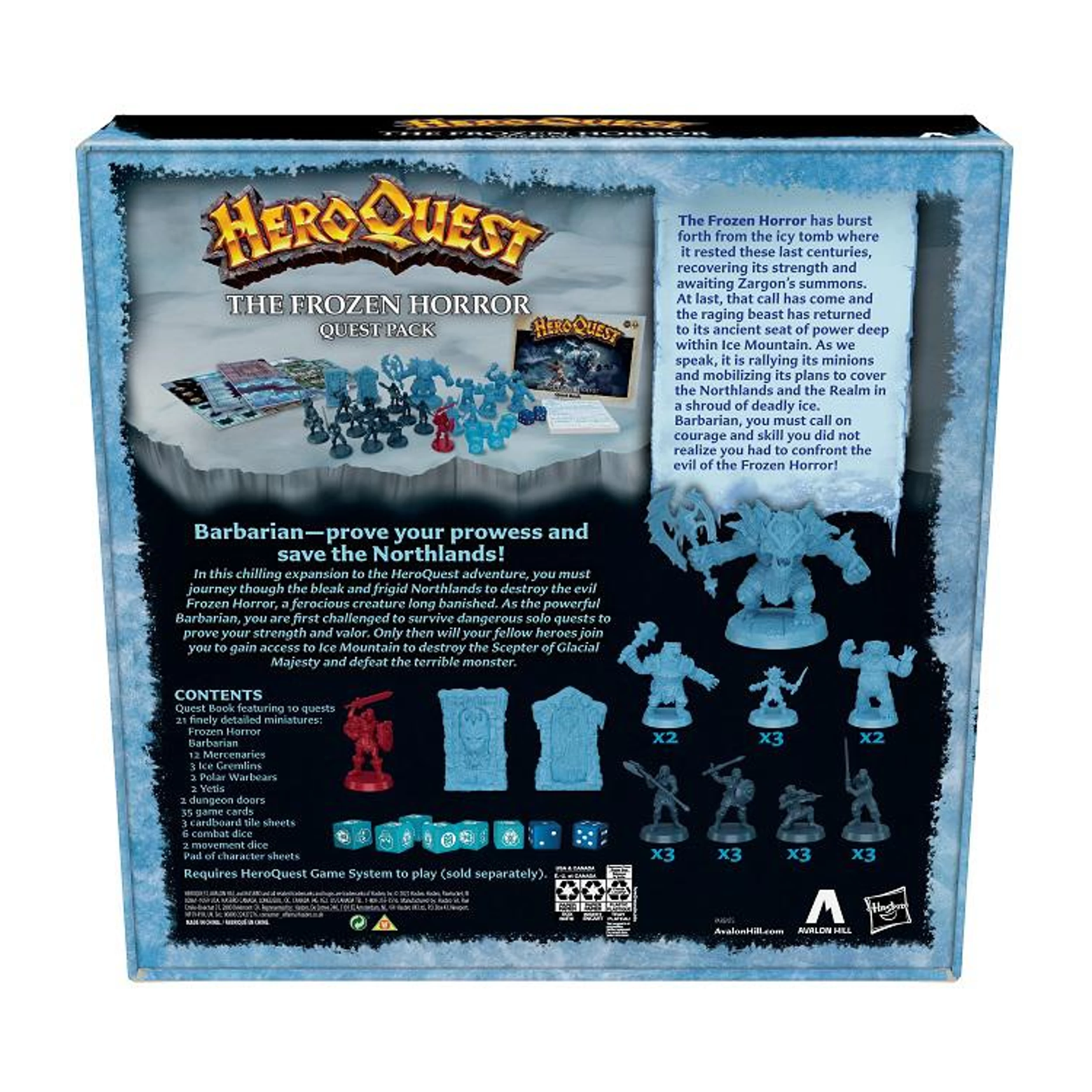 The game has limitless re-playability, and you can also build their own quests and create their own stories. Gather friends together for an exciting night of tabletop gameplay in an epic battle of good and evil. The game is for 2-5 players, ages 14 and up. Includes Quest book featuring 10 quests, 21 finely detailed miniatures (Frozen Horror, Barbarian, 12 Mercenaries, 3 Ice Gremlins, 2 Polar Warbears, 2 Yetis) 2 dungeon doors, 35 game cards, 3 cardboard tile sheets, 6 combat dice, 2 movement dice, pad of character sheets, and instructions.