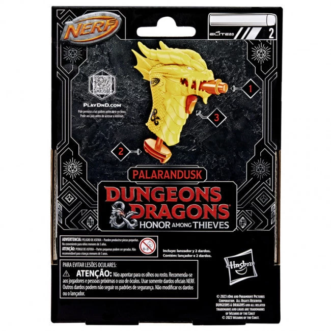The Nerf MicroShots Dungeons and Dragons Palarardusk dart blaster brings home the magic of the Dungeons & Dragons movie: Honor Among Thieves and D&D roleplaying game. The gold dragon blaster launches 1 Nerf Elite foam dart and features a compact size that’s great for high-energy indoor and outdoor games. It is inspired by the gold dragon Palarandusk, the protector of the city of Neverwinter in D&D’s Forgotten Realms. Kids can blast into indoor and outdoor play quickly with this easy-to-use dart blaster. Load a dart into the front of the blaster, pull down the priming handle, and press the trigger to fire. It includes 2 Nerf Elite foam darts. The adventure through the exiciting world of D&D continues as you build your Nef D&D collection of blasters and gear.(Each sold separately, subject to availability.) Eyewear recommended (not included). No batteries required.