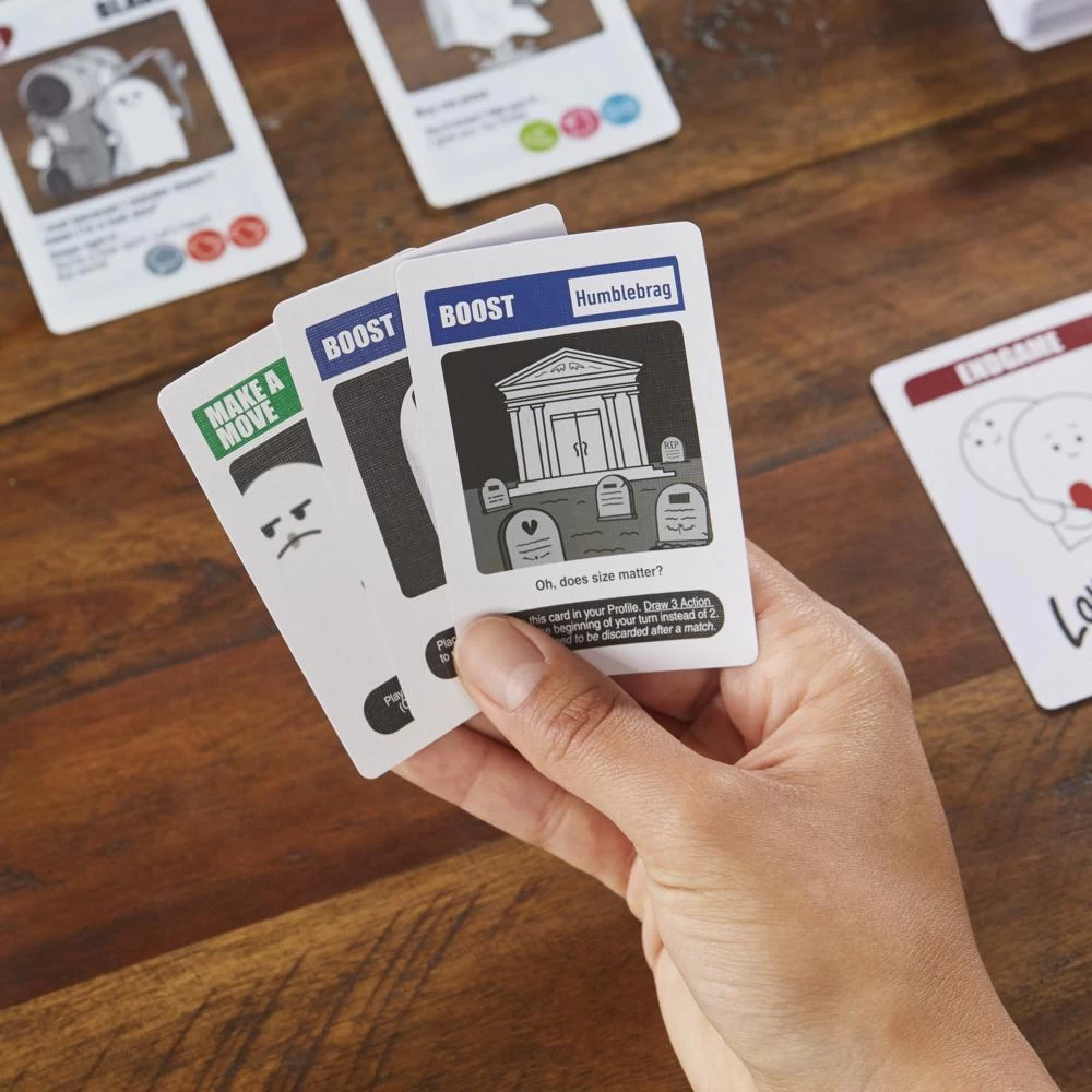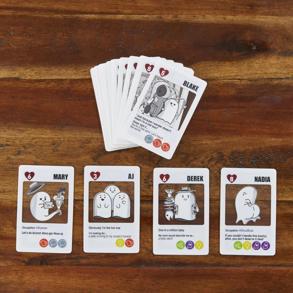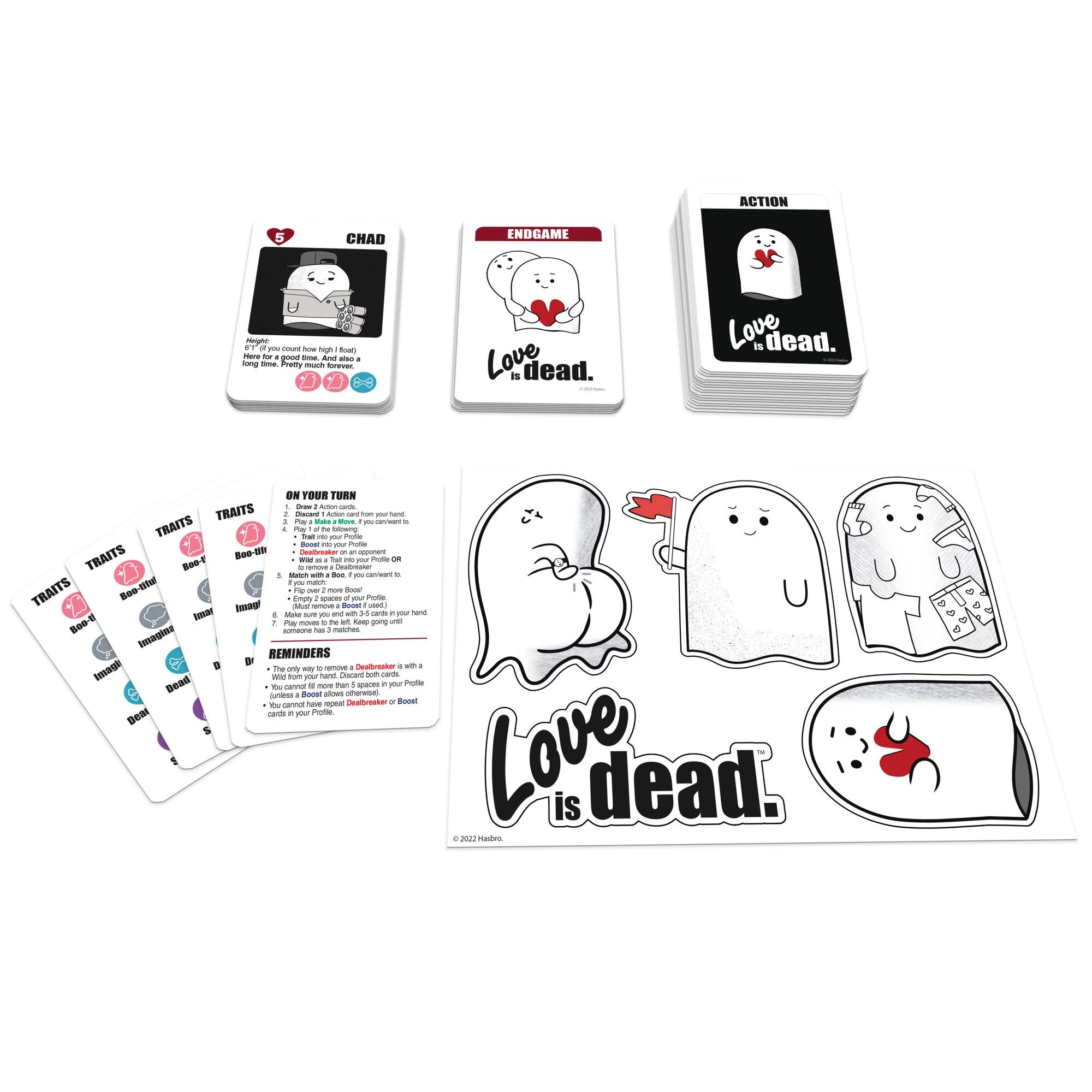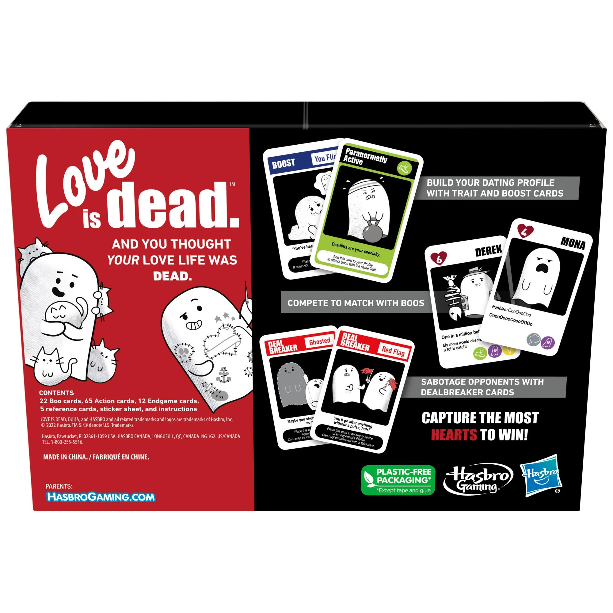 These days, dating can be downright scary. Seriously, who wants to get ghosted? Inspired by modern dating themes, the Love is Dead game is a light strategy party card game for adults and teens. Players compete to match with Boos in the dating pool by playing Trait cards that correspond to the Boo’s traits. Will you match with AJ who’s only looking for a date to their cousin’s funeral? Or Niah, who’ll ghost you just for being an Aries? (Talk about a horror-scope.) Fasten your sheet-belt because other players could be going after the same Boos! In this 2-5 player card game for ages 13 and up, opponents can play negative cards, like Dealbreakers, to sabotage one another. Once a player matches with 3 Boos, the game is over — the player who scores the most points from their matches wins! Love is Dead, Ouija, and all related characters are trademarks of Hasbro. Hasbro Gaming and all related trademarks and logos are trademarks of Hasbro, Inc.