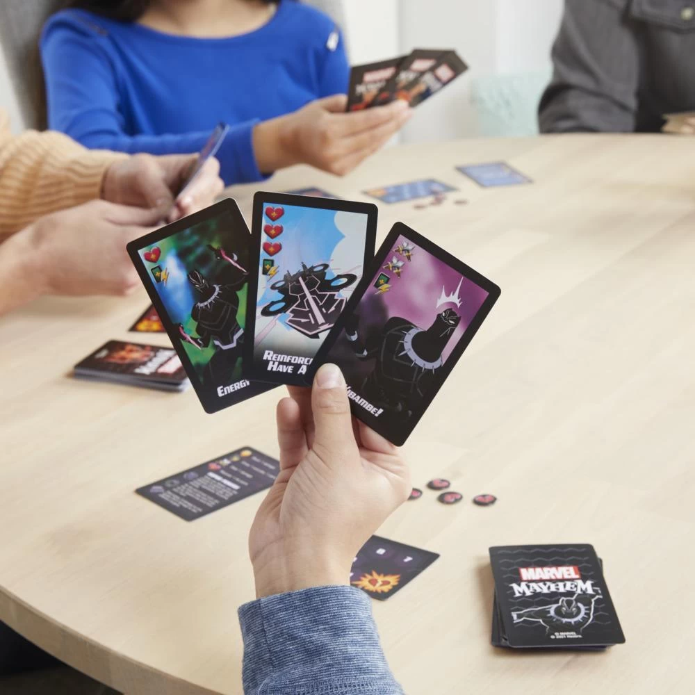 It’s a super-fun, super-exciting Super Hero showdown! In this fast and furious, easy-to-learn game for families and kids 8+, players choose a character deck and play cards that feature unique super powers and allies. Harness Black Panther’s speed, learn the power of manipulation with Scarlet Witch, unleash Captain Marvel’s cosmic powers, or strategize with Iron Man’s armory. Players protect their hit points while doing damage to opponents as they try to be the last Super Hero standing to win. The Marvel Mayhem card game features comic-inspired custom illustrations, iconic Marvel character phrases, and fun humor. This fun card game is filled with action and suspense, and can be played in about 10 minutes. Break out the game for a family game night. It makes a great gift for Marvel fans. Copyright 2021 MARVEL. Hasbro Gaming and all related trademarks and logos are trademarks of Hasbro, Inc.