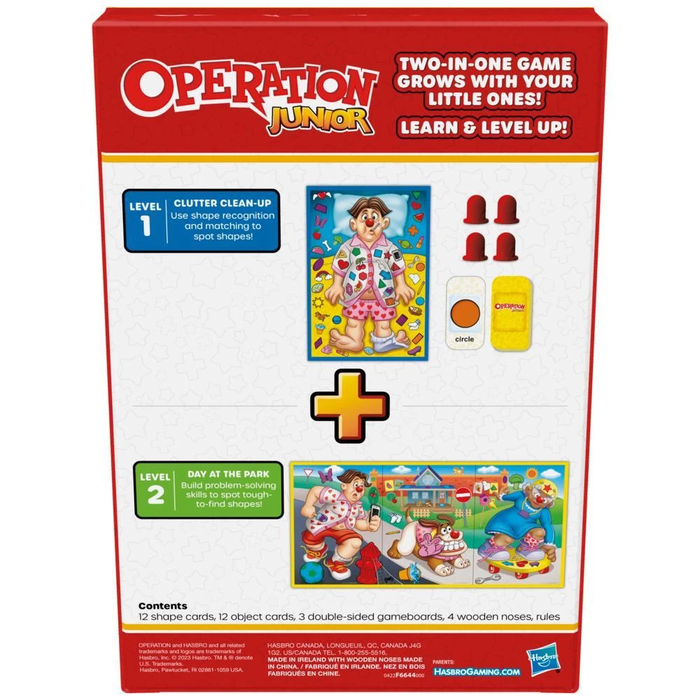 Enjoy 2 games in 1! This Operation Junior board game is the shape-finding adventure that grows with your little one. Players take turns flipping over shape and object cards. In the Level 1 Clutter Clean-Up game, they race to find them in 1 of the 3 gameboards (your choice!). For the advanced Level 2 A Day in the Park game, flip the boards over and connect them to create a silly, slapstick scene full of objects that are harder to find. In either game, the first player to place Cavity Sam’s nose on the shape or object that matches the one on the card collects that card. The player with the most cards in the end wins! Boxed in plastic-free packaging, this game includes 4 FSC-certified wooden noses, plus 12 shape cards, 12 object cards, and 3 double-sided gameboards, all made of FSC-certified paper goods. It’s a fun kids game for playdates, the classroom, and family game night. Operation and Hasbro and all related terms are trademarks of Hasbro.