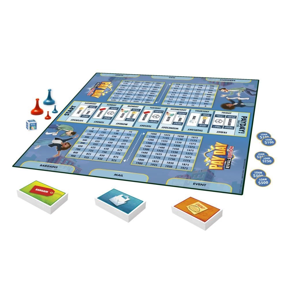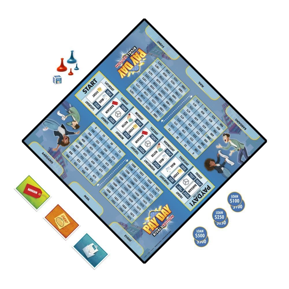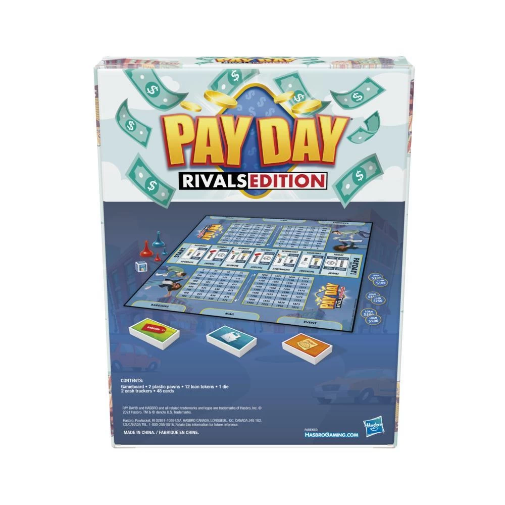 The Pay Day Rivals Edition board game has 2 players going head-to-head in a battle to end up with the most money to win! In this fun game about making and spending money, each player moves their pawn around the game board, finding bargains and unexpected windfalls. Deal with bills that come in the Mail cards such as having to pay library fines or to cover a pedicure. Event cards can bring surprises such as winning cash at Bingo, or paying for a night on the town. Who is the better money manager? The player with the most cash at the end of the game wins. This game about finances is a fun game for kids to play with a family member, or a fun indoor activity for kids ages 8 and up. Hasbro Gaming and all related trademarks and logos are trademarks of Hasbro, Inc.