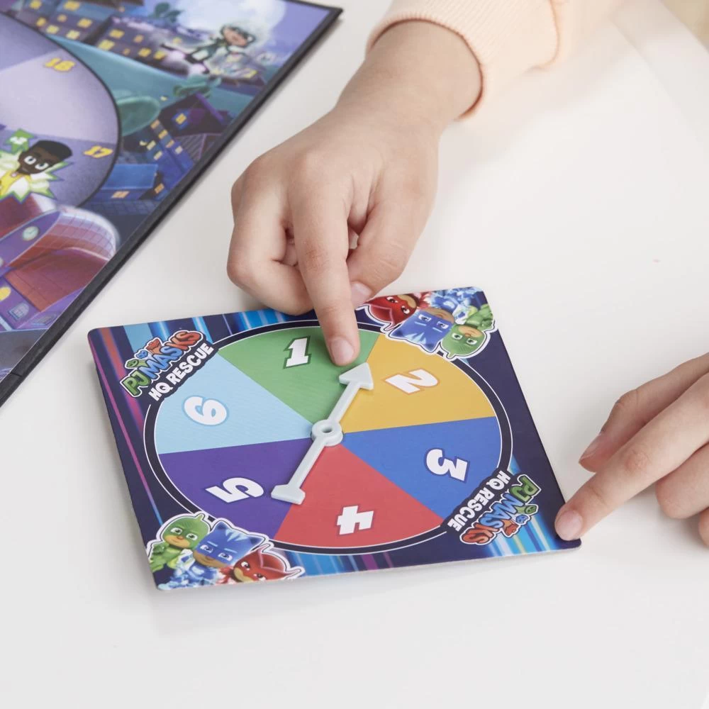 Oh no! Romeo has taken over PJ Masks HQ! Kids can play as a favorite PJ Masks character — Catboy, Gekko, or Owlette — and imagine racing their hero through the city and up to the top of headquarters to save the day. The game includes a 3D plastic HQ tower unit that fits snuggly onto the gameboard. Once a player has made their way around the board and up to the tower, they’re ready to trap Romeo for a super fun winning moment. Pressing the red button on the unit makes the claw release the Romeo figure and it drops into the trap! The PJ Masks HQ Rescue board game is a fun game for preschoolers, and kids ages 4 and up. Hasbro Gaming and all related trademarks and logos are trademarks of Hasbro, Inc. PJ MASKS and all related trademarks and characters Trademark and Copyright 2021 Frog Box and/or Entertainment One UK Ltd. Les Pyjamasques by Romuald © 2007 Gallimard Jeunesse.