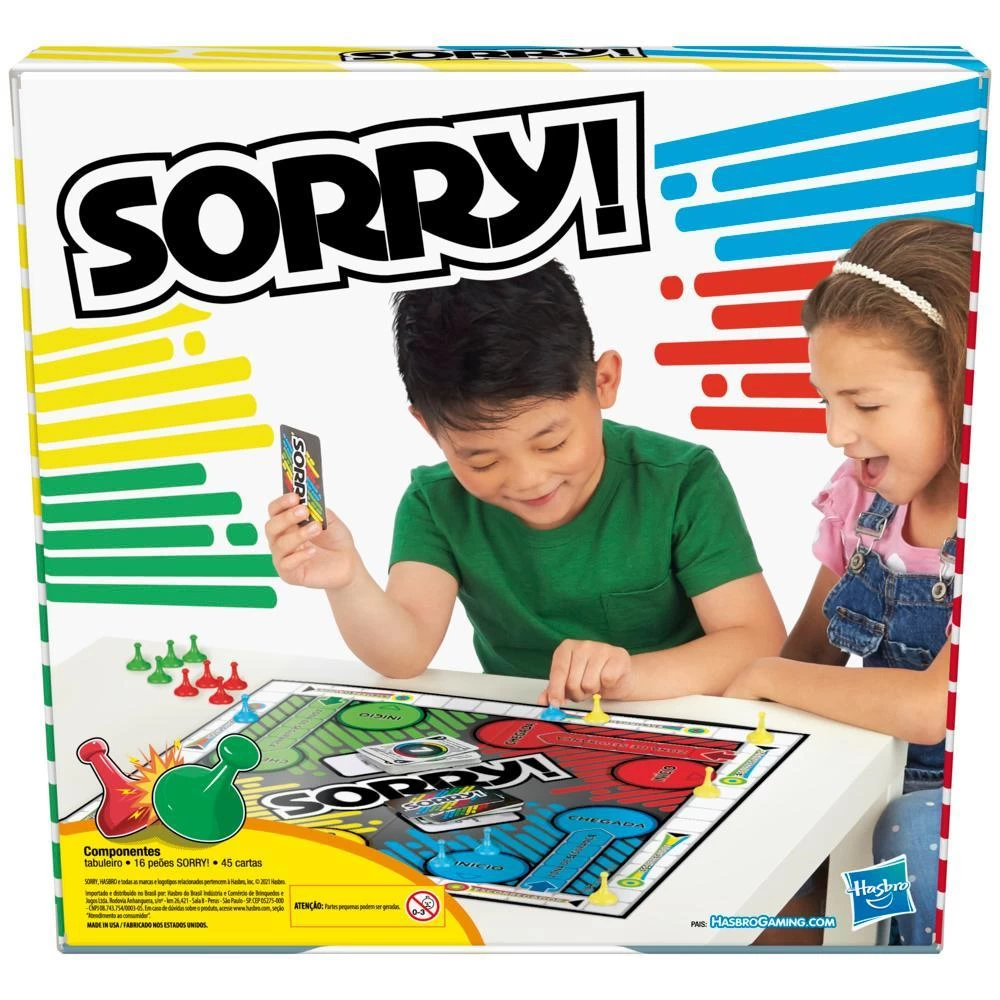 Slide, collide and score to win the Sorry! game! Who knows what will happen next as players chase their opponents around the board, trying to get their 3 pawns from start to home first? Will a player draw a card that tells them to move ahead 2 spaces or back 6? Will someone land on a slide or will an opponent land on a player’s space, sending them back to the start? This iconic children’s game is a great choice for game nights and one of the best indoor games for kids. Kids board games like Sorry! make great family gifts for 8 year old boys and girls and up. Add this family board game for kids to your next Family Game Night! Hasbro Gaming and all related terms are trademarks of Hasbro.