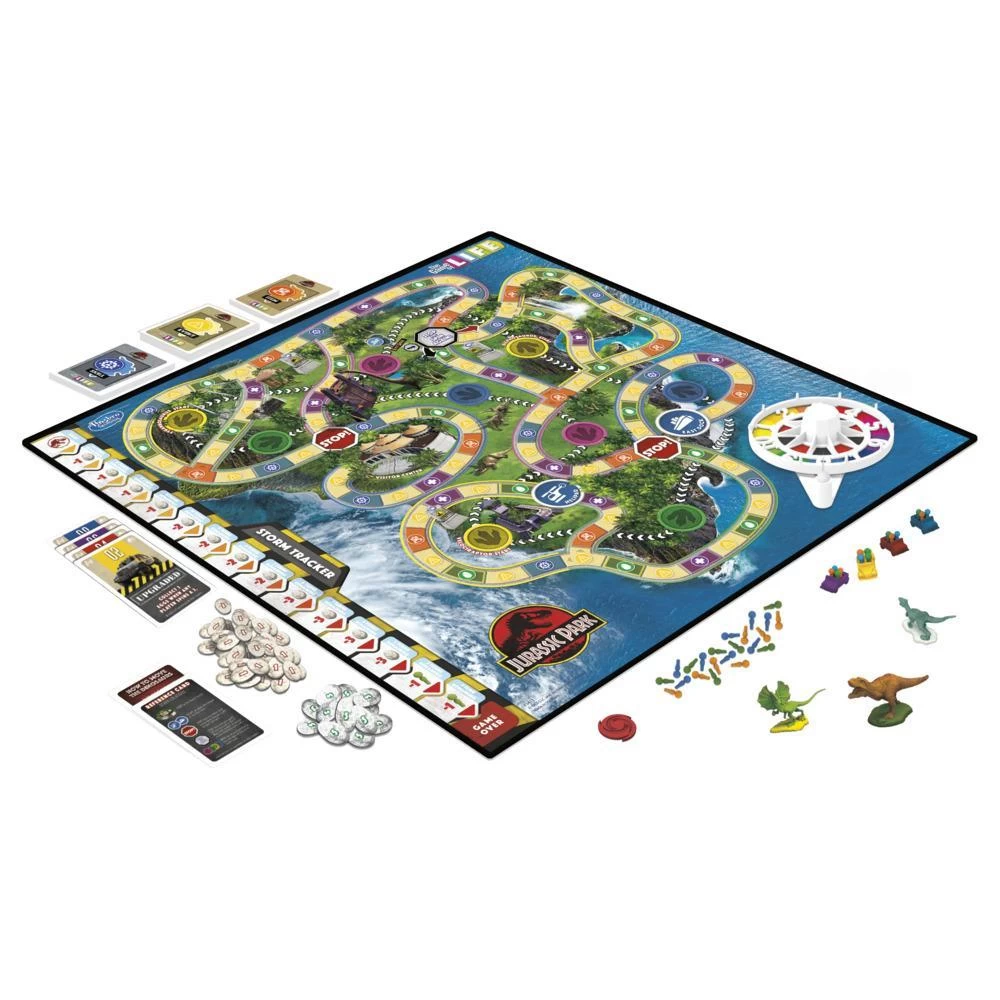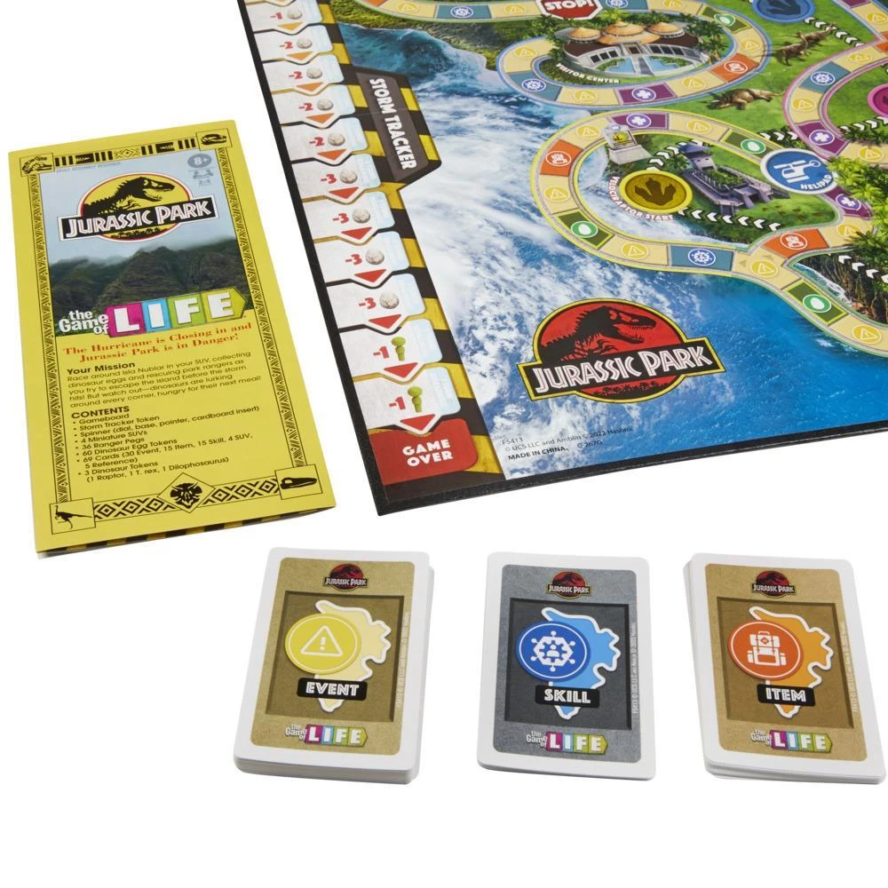 Hold onto your butts! A hurricane is closing in and the Park is in danger. In this The Game of Life Jurassic Park Edition board game, players race around Isla Neblar, collecting Dinosaur Eggs and rescuing Park Rangers as the storm advances and dinos escape! Jurassic Park fans will love the nostalgic nod to the film with blockbuster-inspired twits and turns. Move around the island and draw from interactive cards featuring quotes, characters, and iconic objects from the original film. Be careful! Hungry dinos lurk everywhere! Played in 15 rounds, players have 2 ways to escape the island. Who will play it safe and who will risk it all to save more Eggs and Rangers? Escape the island and get 1 point for every Egg token collected and 3 points for every Ranger in the SUV. The player with the most points wins. This family board game is for ages 8+, and it’s a fun choice for a family game night. THE GAME OF LIFE and HASBRO and all related trademarks and logos are trademarks of Hasbro. © Universal City Studios LLC and Amblin Entertainment, Inc. All Rights Reserved.