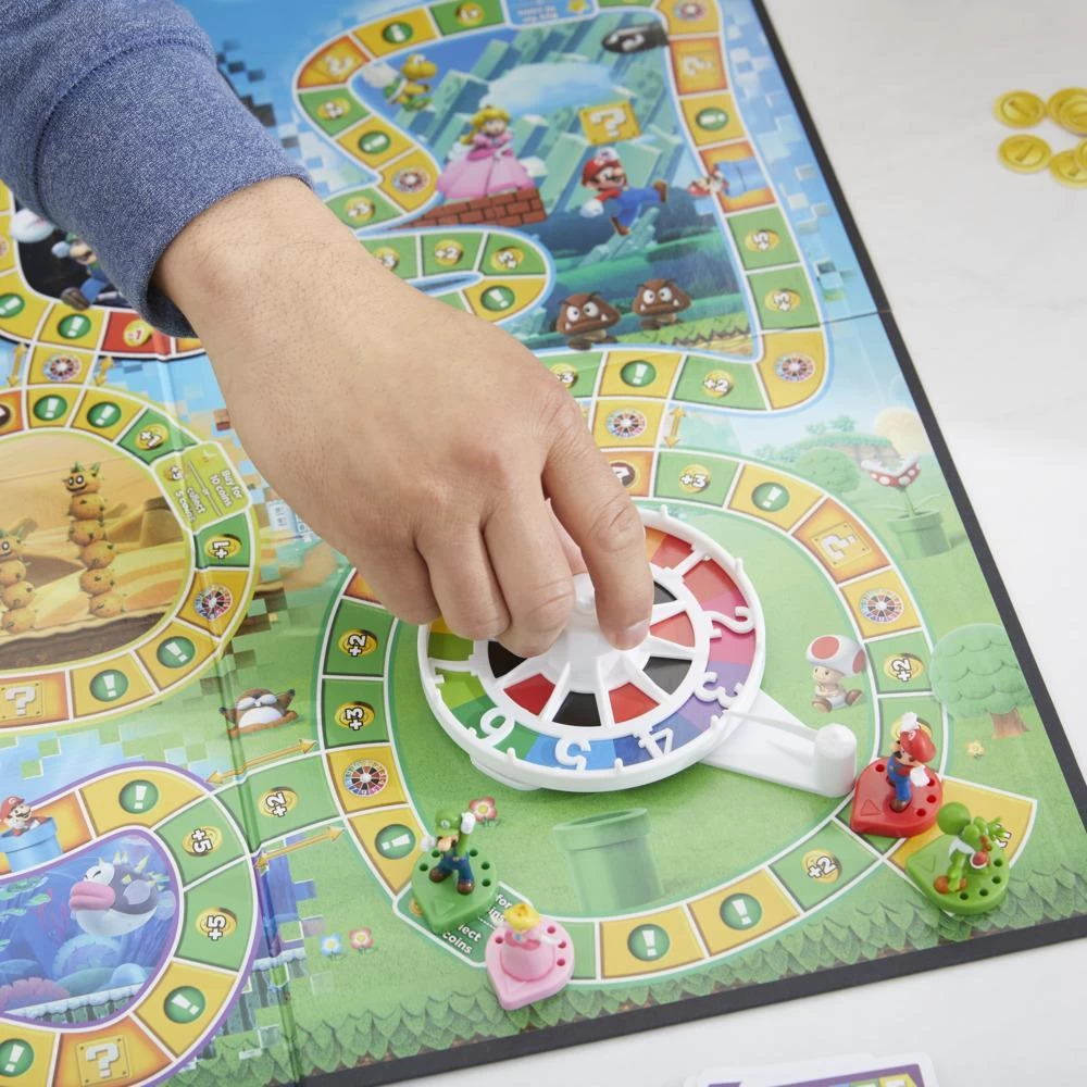 In The Game of Life: Super Mario Edition board game, players choose to play as Mario, Luigi, Peach, or Yoshi, journeying through the Mushroom Kingdom, and finally spinning to win in a battle against Bowser! They move around the looping paths of the gameboard as they collect coins, power up with items and Companions, and play fun minigames along the way such as Rock Paper Scissors, Thumb Wars, and Spin-Offs. As they approach Bowser’s Castle, players will also buy stars to boost their battle-spin; each star collected adds 1 point to their spin total, and players will need to spin higher than a 12 to defeat Bowser and win the game. This fun game for kids and families is for 2-4 players, ages 8 and up. TM and Copyright 2021 Nintendo. Hasbro Gaming and all related trademarks and logos are trademarks of Hasbro, Inc.