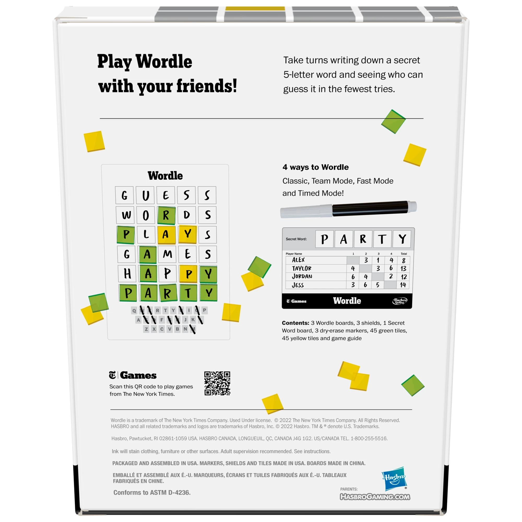 Love Wordle? Gather friends and family together to enjoy the favorite word-guessing game in real life with Wordle: The Party Game! Inspired by the digital version of the Wordle game, this analog game for 2-4 players delivers the classic Wordle gameplay as an exciting party game. Each round, a player designated as the Wordle Host writes down a Secret Word. Just like the original Wordle game, players try to guess it in the fewest tries (six max). But in this game, players are competing against others. The fewer tries a player needs, the fewer points they score. The player with the fewest points at the end of the game wins! Best of all, Wordle: The Party Game can be played more than once a day—the included dry-erase Wordle boards and markers mean unlimited play! To switch up the gameplay, choose from 3 more variations: fast, timed, or teams. A great game for game night with friends and family, Wordle: The Party Game makes a fun gift for ages 14 and up. Wordle is a trademark of The New York Times Company. Used under license. Hasbro and all related terms are trademarks of Hasbro.